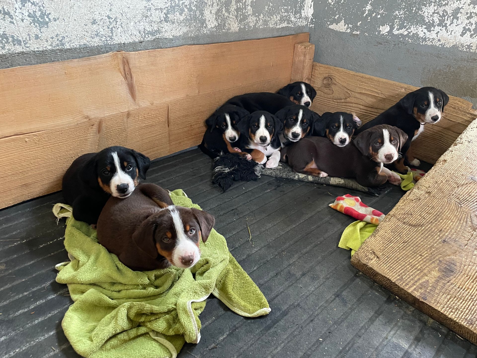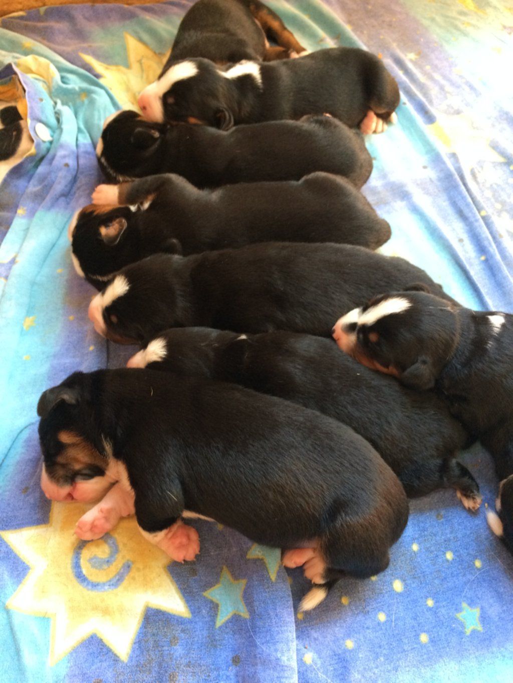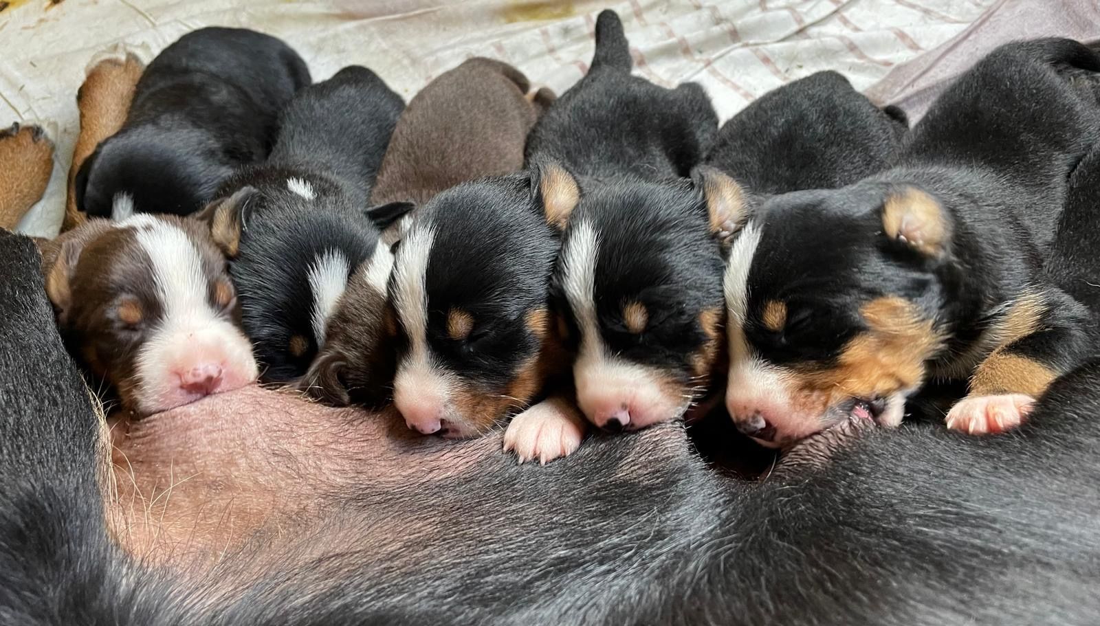 Es sind 4 Hündinnen und 5 Rüden. Sieben Welpen sind schwarz-braun-weiss, zwei Welpen sind havannabraun-braun-weiss.